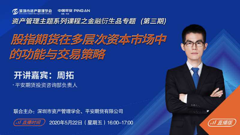 5月22日下午,由深圳市资产管理学会和平安期货联合主办,资产管理主题系列课程第三期圆满举办。主讲人周拓先生,结合自己多年期货研究和投资经验,为我们分享股指期货在多层资本市场中的功能与交易策略。直播间听众反响热烈,积极交流股指期货相关知识。