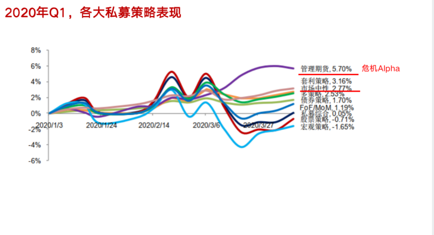 然后,周拓先生为我们分享了股指期货的交易策略,股指期货的主流量化策略包括了以下4种:寻找市场错误定价的机会来建立相反方向的头寸获利的套利策略、寻找事件冲击效果显著的股票实现事件驱动的策略、通过对冲系统风险获得超额收益的Alpha策略、通过市场波动方向判断赚钱趋势的Beta策略。并且举例画图说明了2020第一季度各大私募策略的表现。如下图所示。