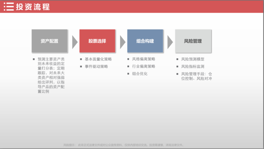 接着,黄栋先生为我们介绍了量化投资的投资流程,由资产配置到股票选择再到组合构建,最后到风险管理。