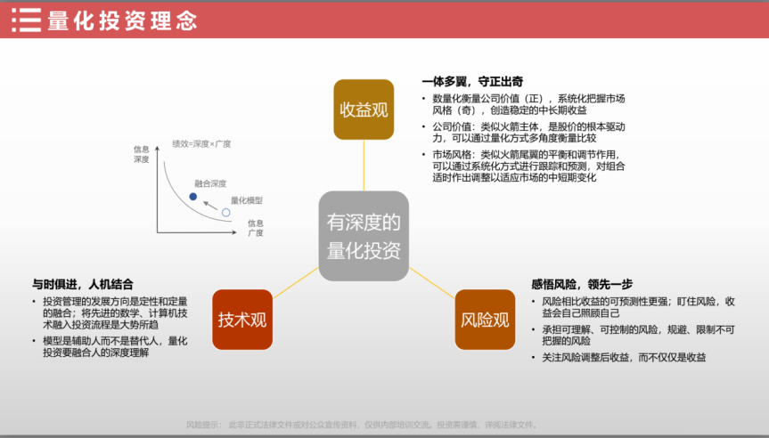 数学、计算机技术融入投资流程是大势所趋;从风险观的角度来看,是感悟风险领先一步,承担可理解、可控制的风险,规避、限制不可把握的风险。