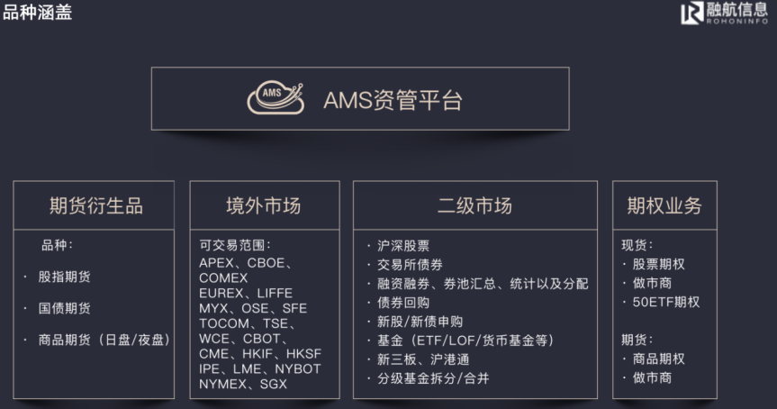 在AMS资管平台,境内外全市场对接覆盖,包括国内期货期权和证券市场以及海外市场。