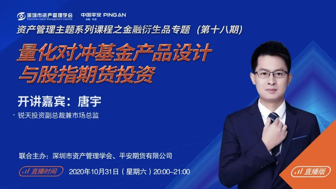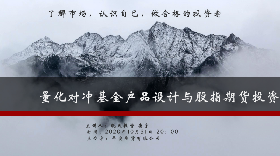 10月31日晚,由深圳市资产管理学会和平安期货联合主办的资产管理主题系列课程之金融衍生品专题第十八期圆满结束。本期讲座特邀锐天投资副总裁兼市场总监唐宇先生担任主讲嘉宾,以“量化对冲基金产品设计与股指期货投资”为主题展开分享,讲座主要包含2个部份,一是介绍量化对冲基金产品,二是分析量化对冲与股指期货投资策略。