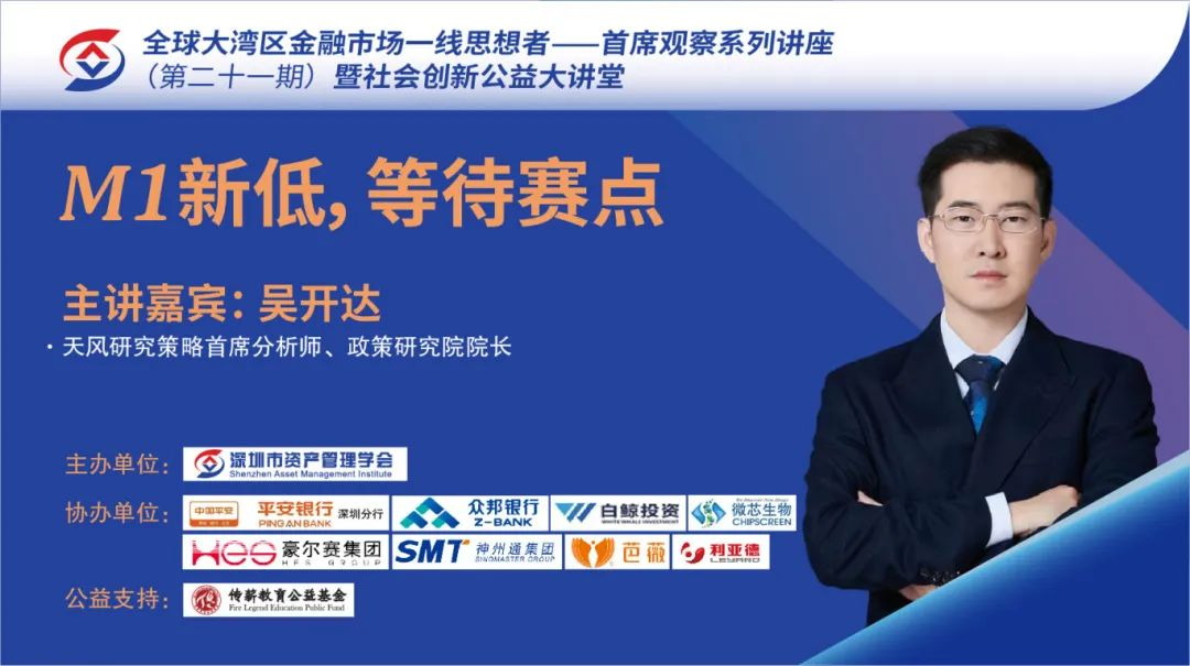 2024年9月6日下午,由深圳市资产管理学会主办的全球大湾区金融市场一线思想者——首席观察系列讲座第二十一期暨社会公益大讲堂活动圆满结束,直播间共计3000余人次观看。本期深圳市资产管理学会邀请了天风研究策略首席分析师、政策研究院院长吴开达,为大家分享“M1新低,等待赛点”主题讲座。