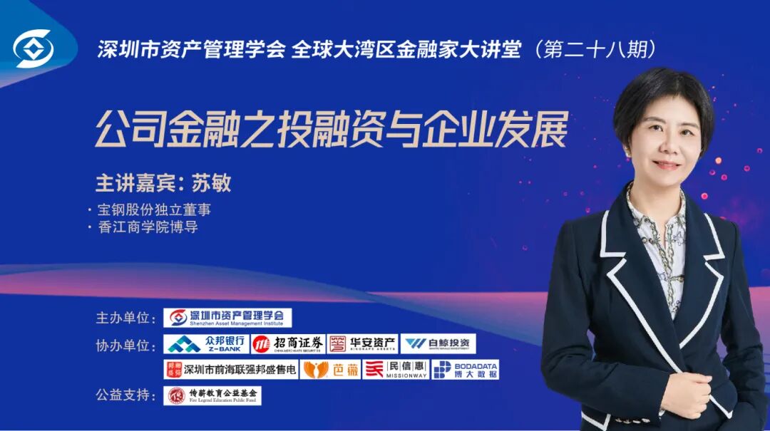 2025年9月22日下午,由深圳市资产管理学会主办的全球大湾区金融家大讲堂第28期暨社会公益大讲堂活动圆满结束,直播间共计3500余人次观看。本期深圳市资产管理学会邀请了宝钢股份独立董事、香江商学院博导苏敏老师,为大家分享“公司金融之投融资与企业发展”主题讲座。