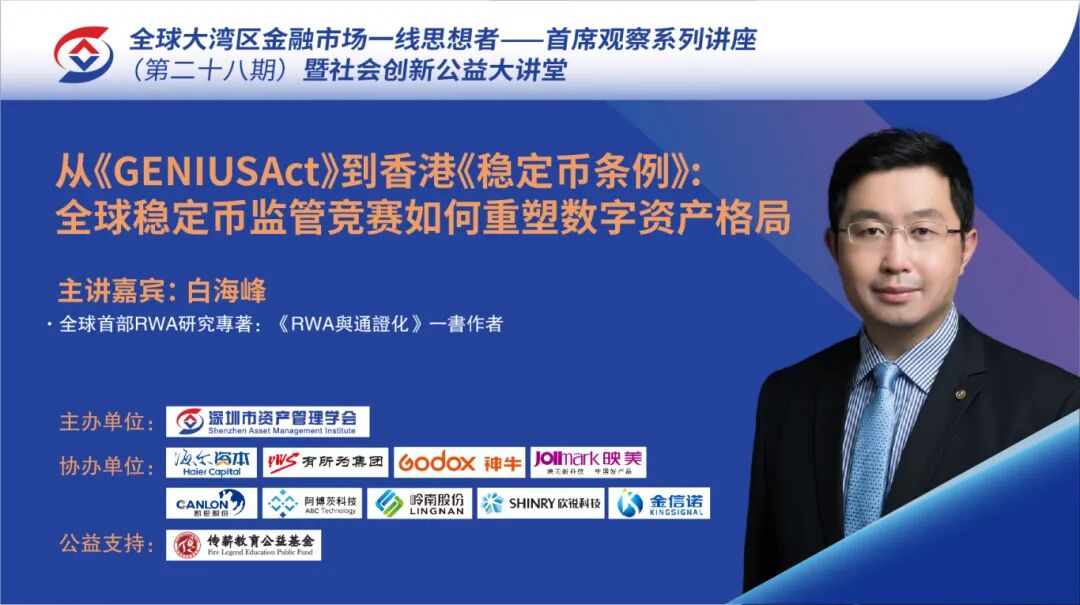2025年6月20日下午,由深圳市资产管理学会主办的全球大湾区金融市场一线思想者——首席观察系列讲座第二十八期暨社会公益大讲堂活动圆满结束,直播间共计3000余人次观看。本期深圳市资产管理学会邀请了全球首部RWA研究專著:《RWA與通證化》一書作者白海峰先生,为大家分享“从《GENIUSAct》到香港《稳定币条例》:全球稳定币监管竞赛如何重塑数字资产格局”主题讲座。
