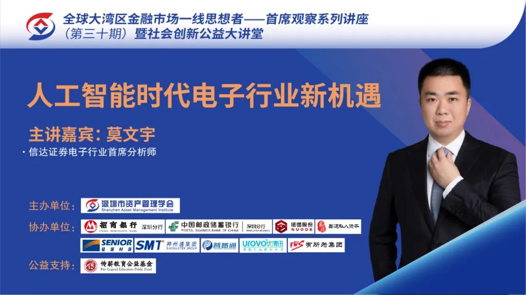 2026年1月15日下午,由深圳市资产管理学会主办的全球大湾区金融市场一线思想者——首席观察系列讲座第三十期暨社会公益大讲堂活动圆满结束,直播间共计2000余人次观看。本期深圳市资产管理学会邀请了信达证券电子行业首席分析师莫文宇先生,为大家分享“人工智能时代电子行业新机遇”主题讲座。